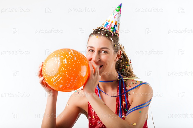 Улыбающаяся женщина празднует день рождения с конфетти и воздушным шариком