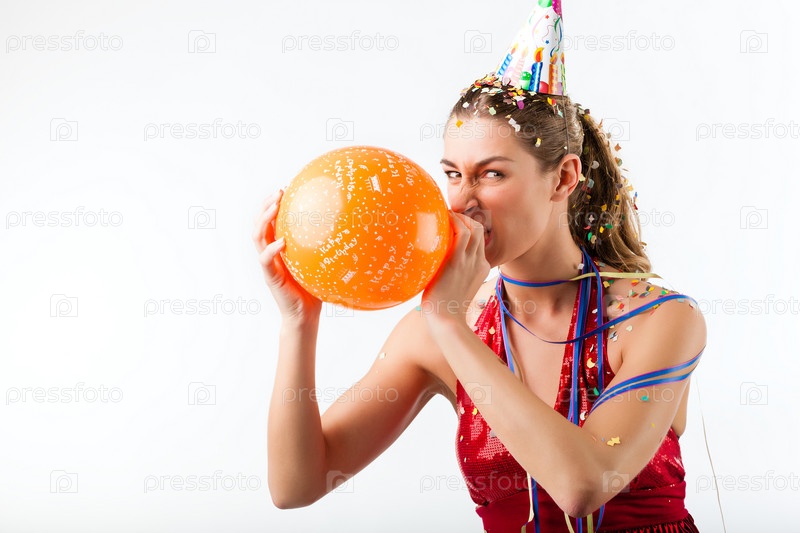 Женщина празднует день рождения с конфетти и воздушным шариком