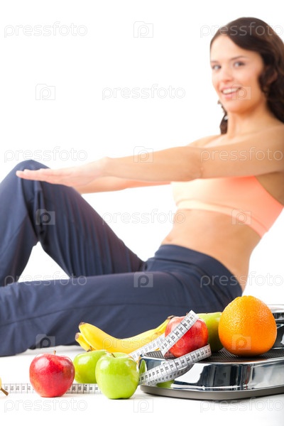 Молодая женщина делает упражнения на фоне фруктов и сантиметровой ленты