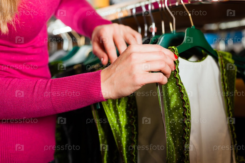 Молодая женщина покупает традиционный костюм в магазине