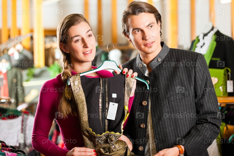 Молодая пара покупает традиционный костюм в магазине