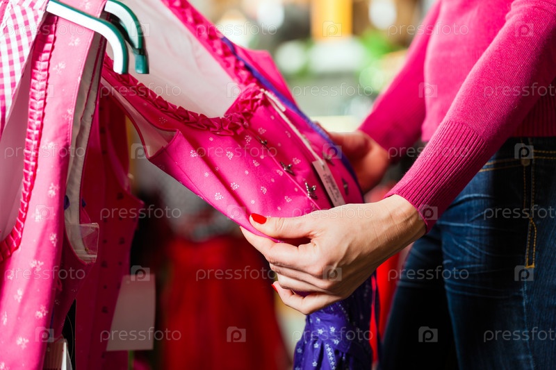 Молодая женщина покупает традиционный костюм в магазине