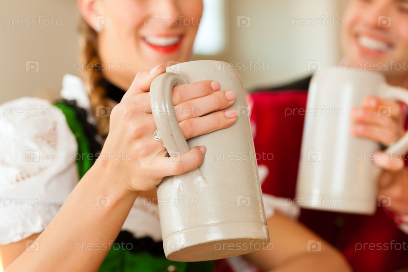 Молодая пара в традиционных баварских костюмах в ресторане или пабе с пивом
