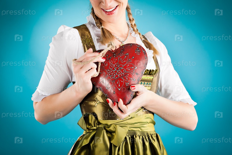 Молодая женщина в традиционном баварском костюме с сердцем в студии