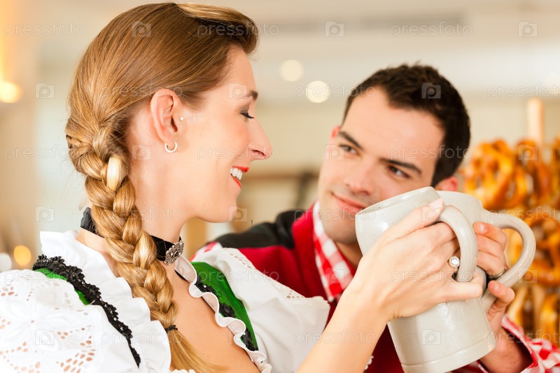 Молодая пара в традиционных баварских костюмах в ресторане или пабе с пивом