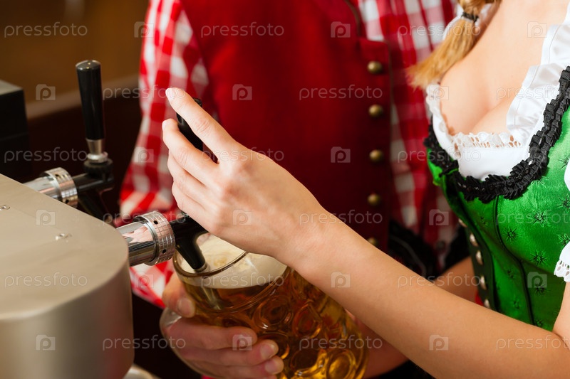 Молодая пара в традиционных баварских костюмах в ресторане или пабе. Женщина наливает пиво