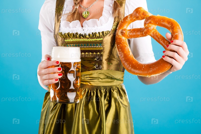 Молодая женщина в традиционном баварском костюме с пивом и кренделем