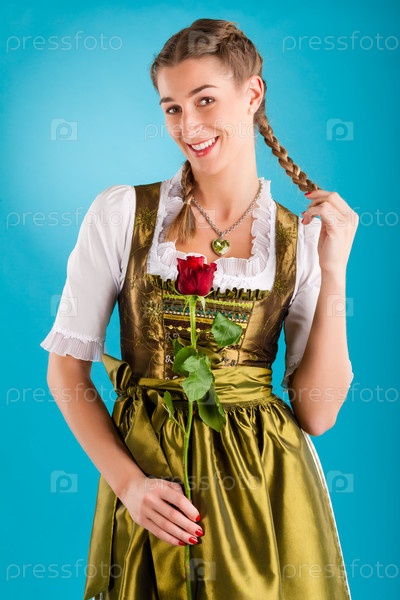 Молодая женщина в традиционном баварском костюме с розой