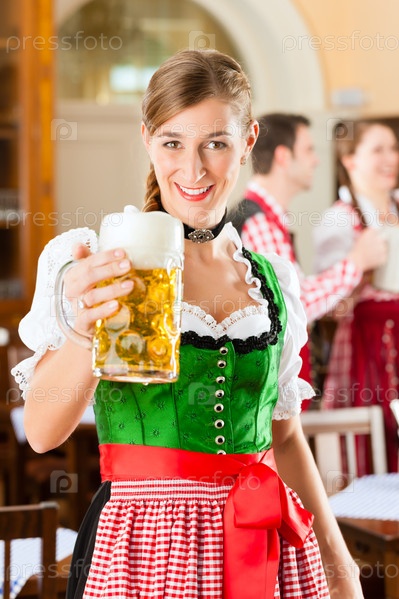 Молодые люди в традиционных баварских костюмах в ресторане или пабе с пивом. Женщина на переднем плане