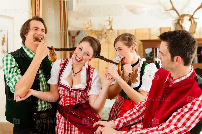 Молодые люди в традиционных баварских костюмах дурачатся с волосами