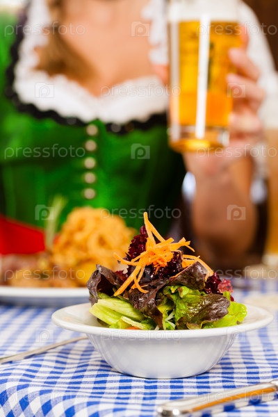 Молодые люди в традиционных баварских костюмах обедают или ужинают в ресторане