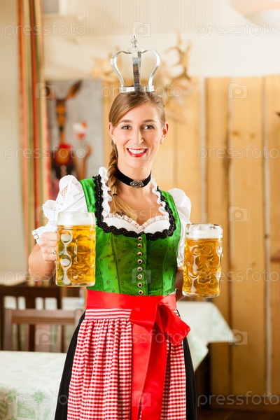 Молодая женщина в традиционном баварском костюме в ресторане с короной на голове и кружками пива