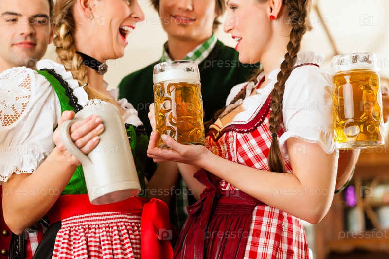 Молодые люди в традиционных баварских костюмах в ресторане или пабе с пивом