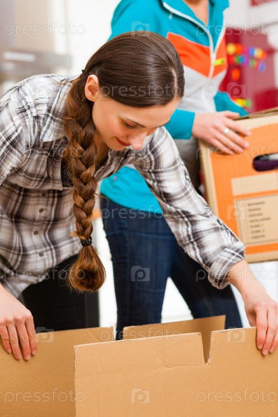 Молодые подруги с коробками после переезда в новую квартиру