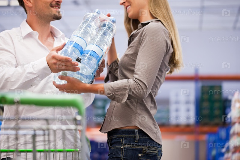 Пара с упаковкой воды в супермаркете