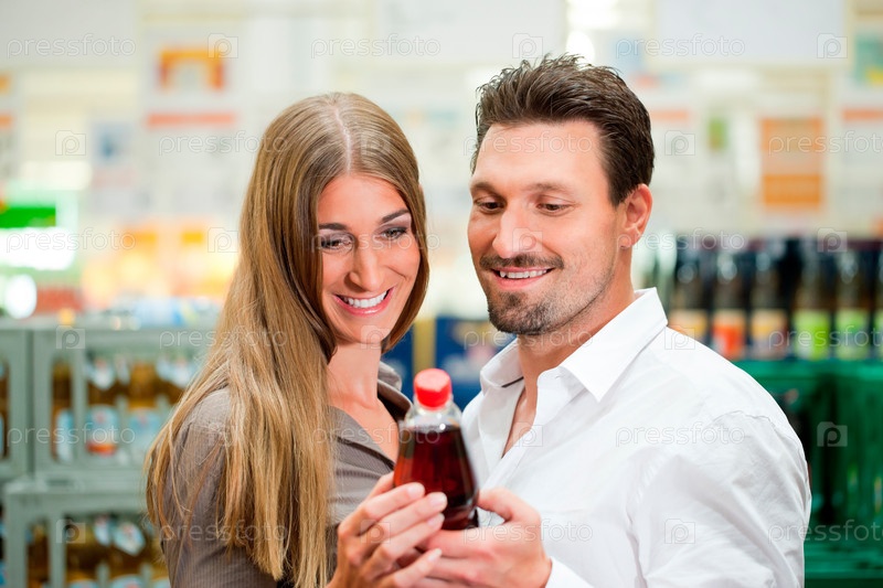 Пара смотрит на бутылку в супермаркете