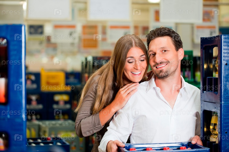 Молодая пара в магазине с бутылками