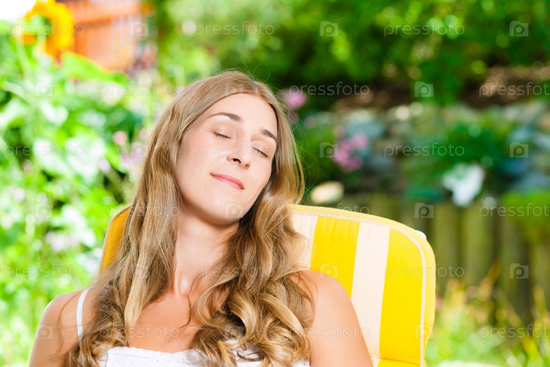 Женщина загорает на шезлонге в саду