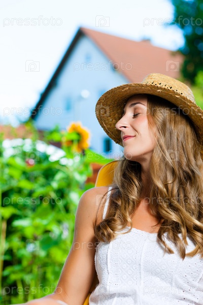Женщина загорает на шезлонге в саду