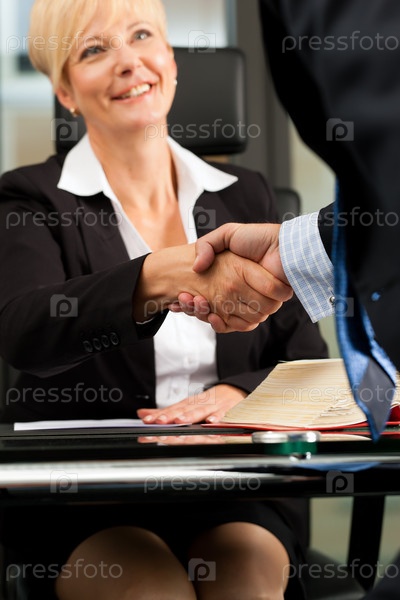 Зрелая женщина-адвокат или нотариус жмет руку клиенту