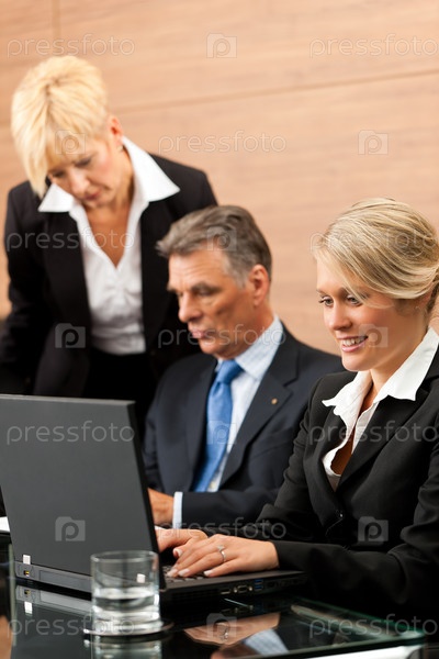 Встреча босса и сотрудников с ноутбуком в офисе