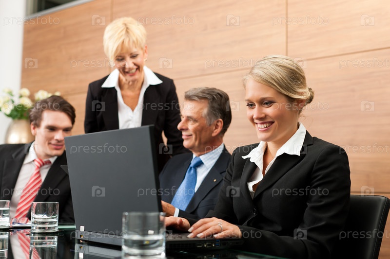 Встреча босса и сотрудников с ноутбуком в офисе