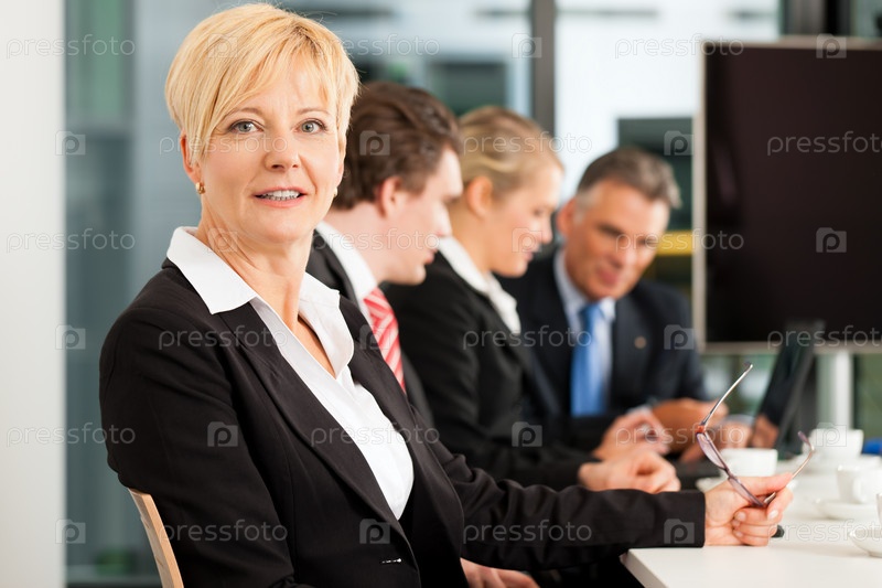 Бизнес-команда в офисе. Женщина-босс смотрит в камеру
