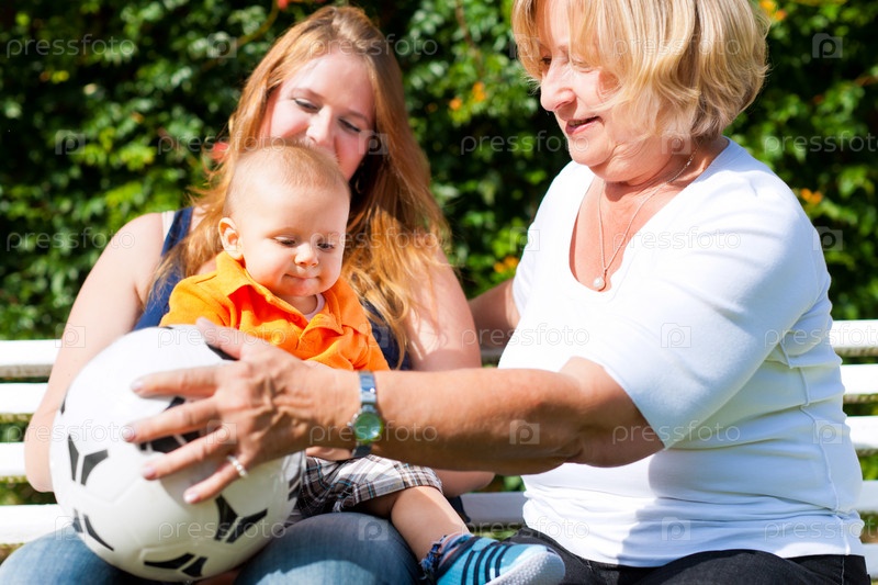 Мать и бабушка играют с ребенком в парке