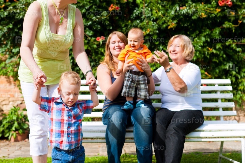 Две молодые матери с детьми и бабушка в парке