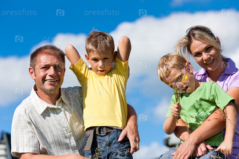 Счастливая семья на свежем воздухе в летний день на фоне голубого неба