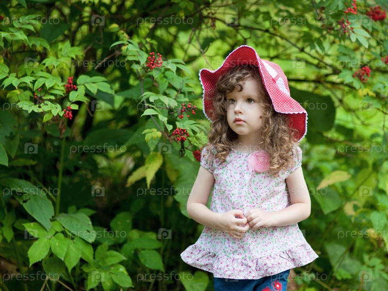 Маленькая кудрявая девочка в красной шапочке в лесу