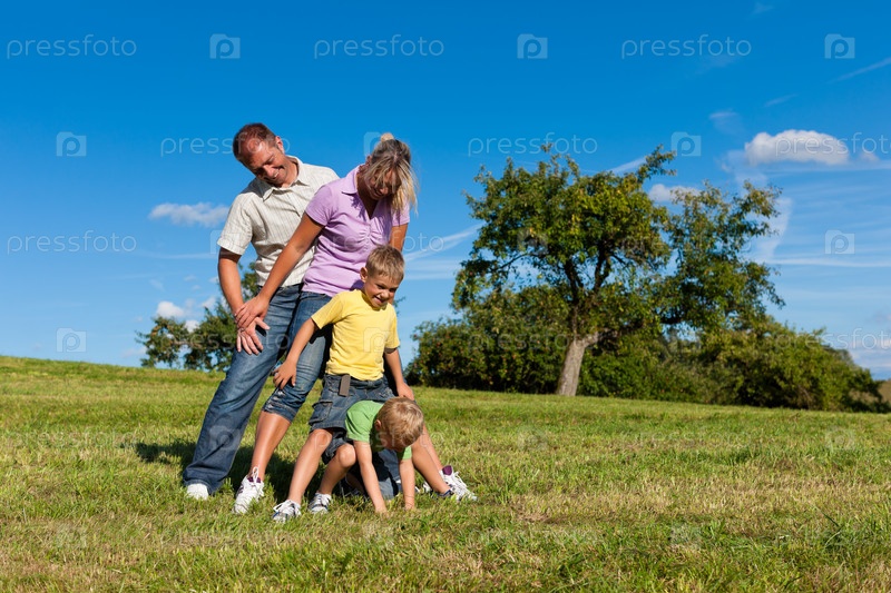 Счастливая семья с двумя мальчиками играет на лугу летом