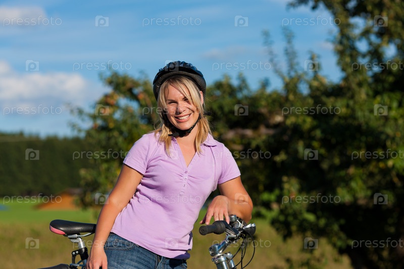 Женщина в велосипедном шлеме с велосипедом в летний день