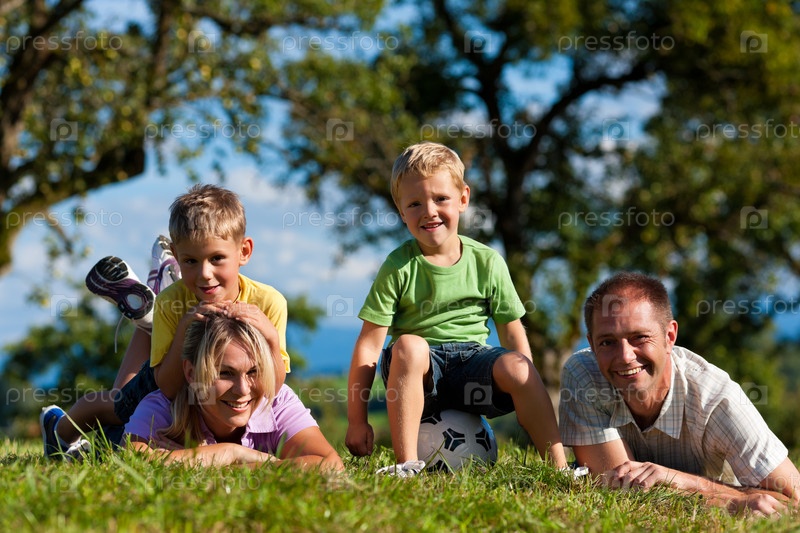 Счастливая семья с двумя мальчиками играет в футбол на лугу летом