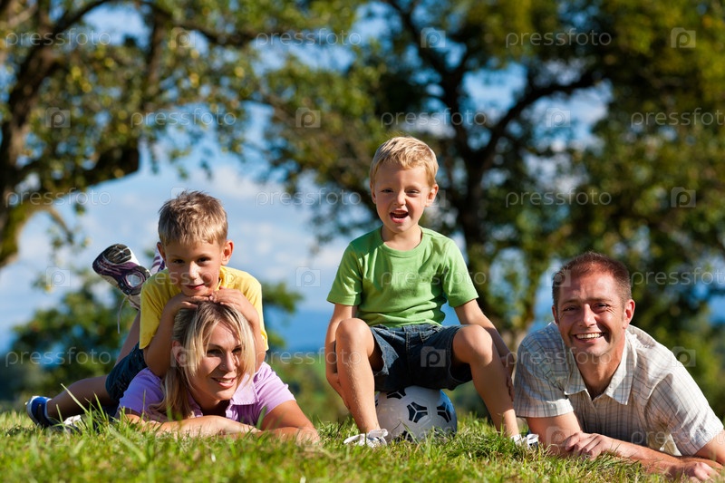 Счастливая семья с двумя мальчиками играет в футбол на лугу летом