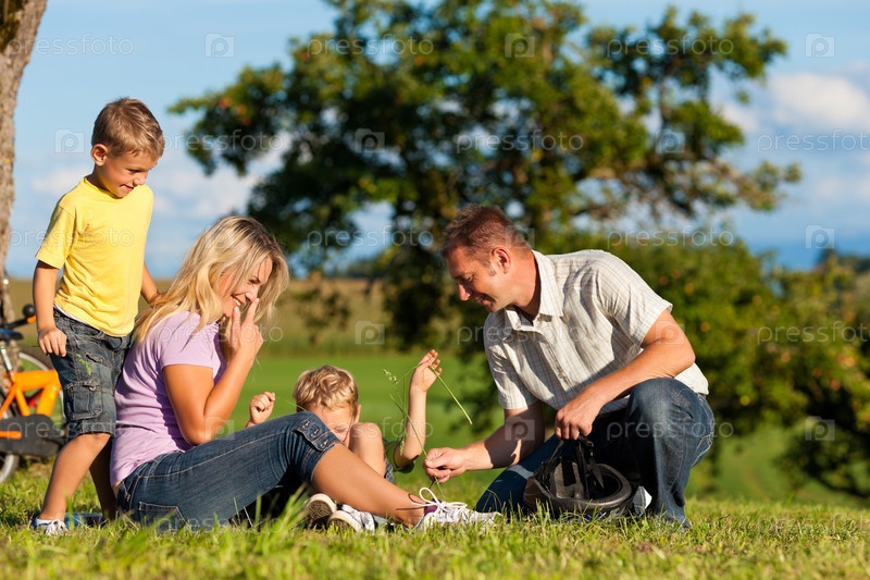Отец, мать и двое сыновей отдыхают во время велосипедной прогулки