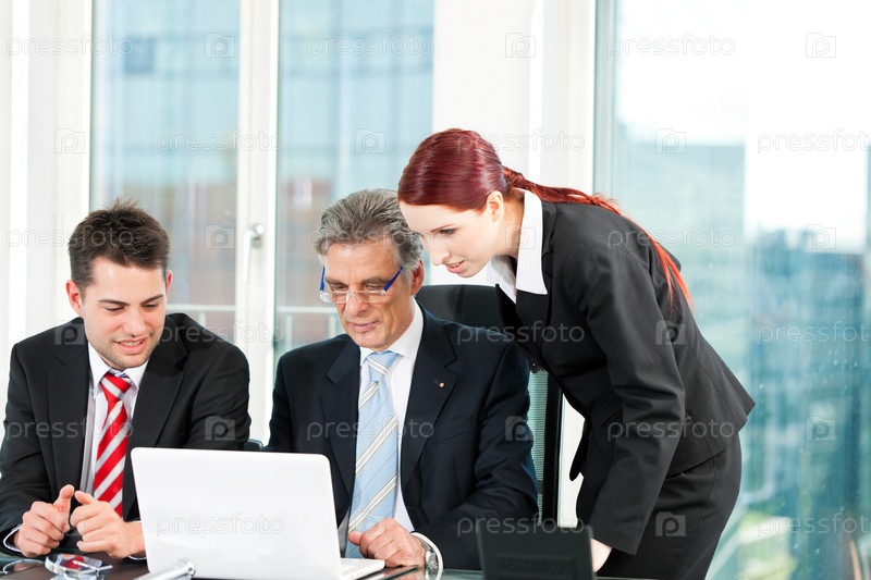 Бизнес-команда в офисе с ноутбуком и боссом