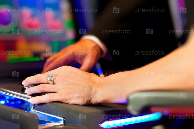 Пара в казино играет на автоматах. руки крупным планом