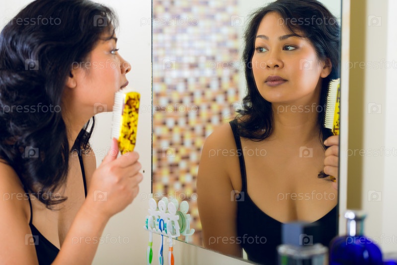 Азиатская женщина расчесывает волосы перед зеркалом в своей ванной комнате