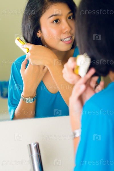 Азиатская женщина расчесывает волосы перед зеркалом в своей ванной комнате