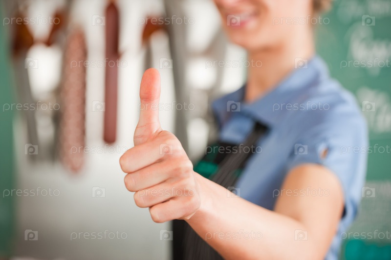 Женщина-мясник показывает палец вверх