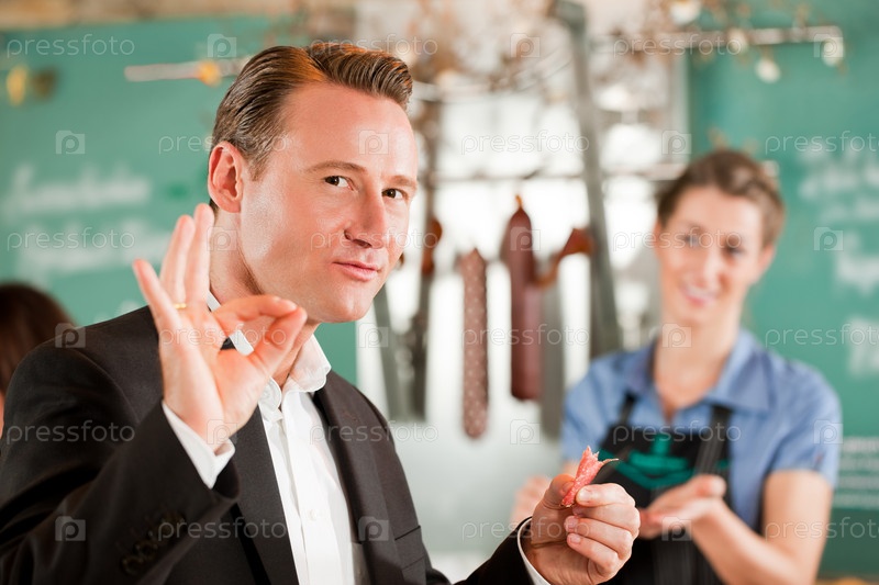 Счастливый клиент в мясной лавке