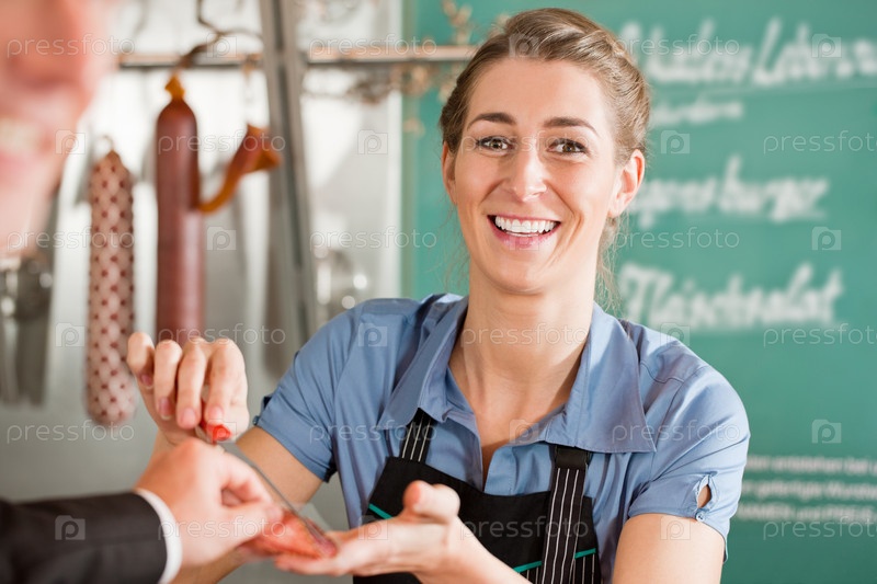 Мясник дает попробовать мясо клиенту