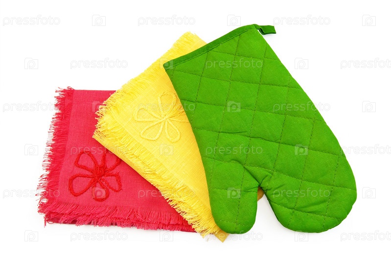 Цветные кухонные салфетки и прихватка на белом фоне