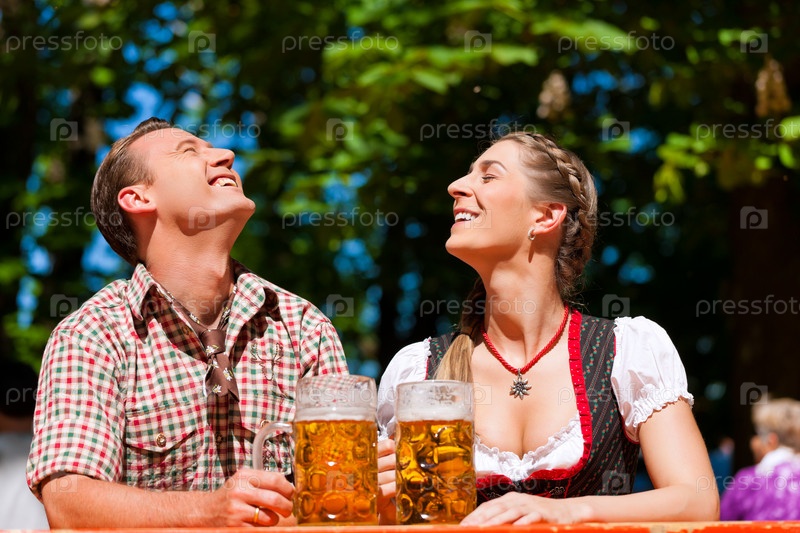 Счастливая пара наслаждается баварским пивом в саду на солнце