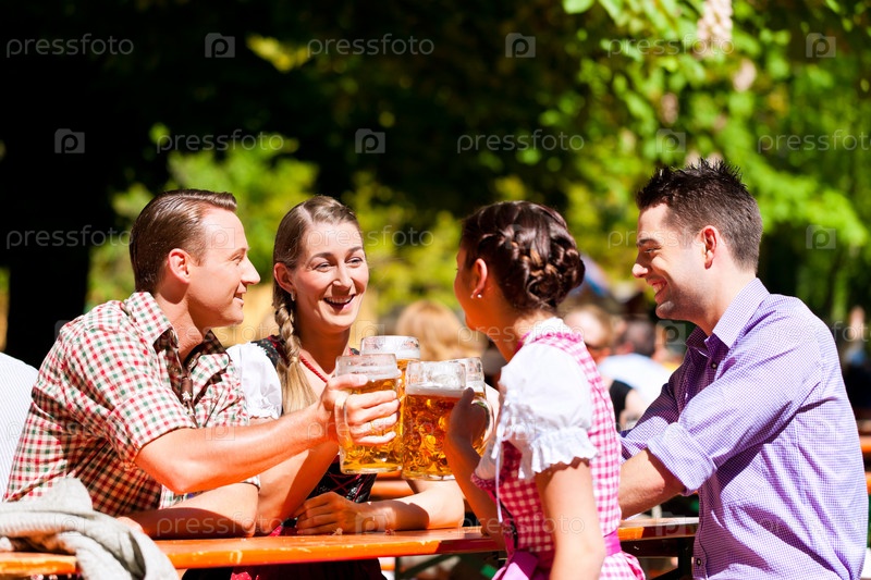 Две счастливые пары наслаждаются баварским пивом в саду на солнце