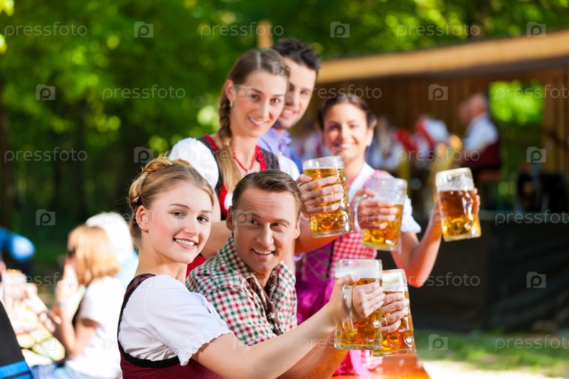 Компания друзей в пивном саду пьет пиво в Баварии, Германия