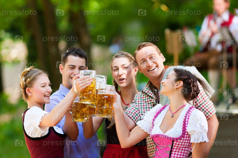 Компания друзей в пивном саду пьет пиво в Баварии, Германия