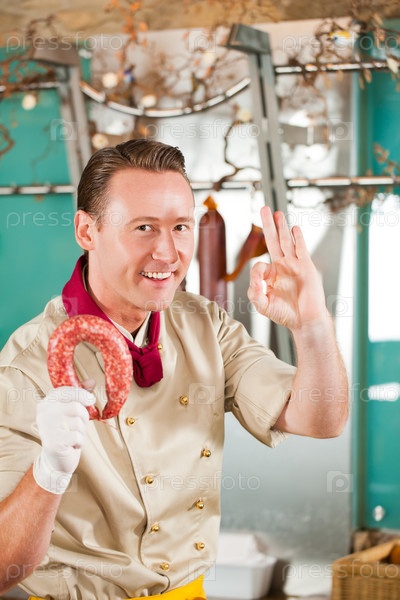 Мясник со свежей копченой колбасой