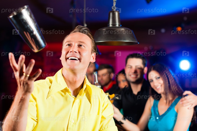 Молодой бармен смешивает коктейли и выполняет трюки